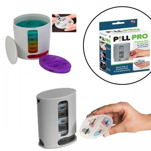 Cutia organizator pentru medicamente contine 7 sertare individuale notate cu zilele saptamanii si cate 4 compartimente separate pentru fiecare sertar cu denumiri distincte, pentru a facilita depozitarea cu usurinta a pastilelor;