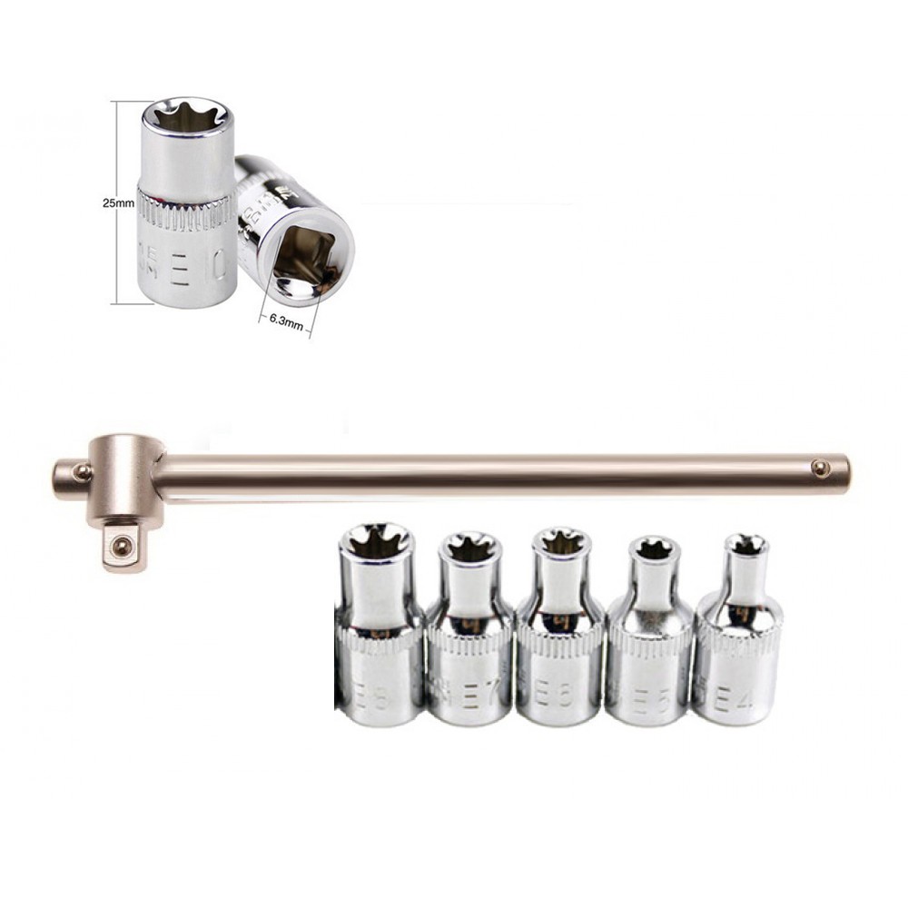 Setul contine 5 chei tubulare Torx interior E4,E5,E6,E7,E8 si antrenor culisabil de 1/4.