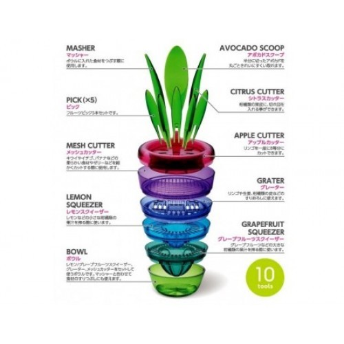 Setul contine mai multe instrumente pentru decojit, feliat, stors, curatat, scos samburi, etc.