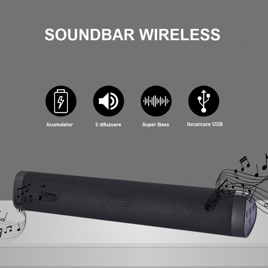 Sistemul bluetooth soundbar A15 suport card TF, dispune de slot Aux si redare prin Bluetooth V5. Distanta pana la 10 metri. Compatibil cu orice dispozitiv handsfree . Sunetul clar si bass puternic, te poti bucura de muzica oricand si oriunde